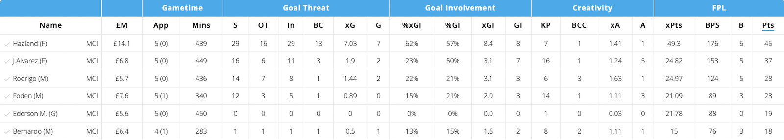 - Julian Alvarez has seven goal contributions and has scored 37 points so far this season, only eight less than Haaland and he costs only 6.8 Million. Alvarez is also Man City’s corner taker and direct free-kick taker this season and has played 449/450 possible minutes.