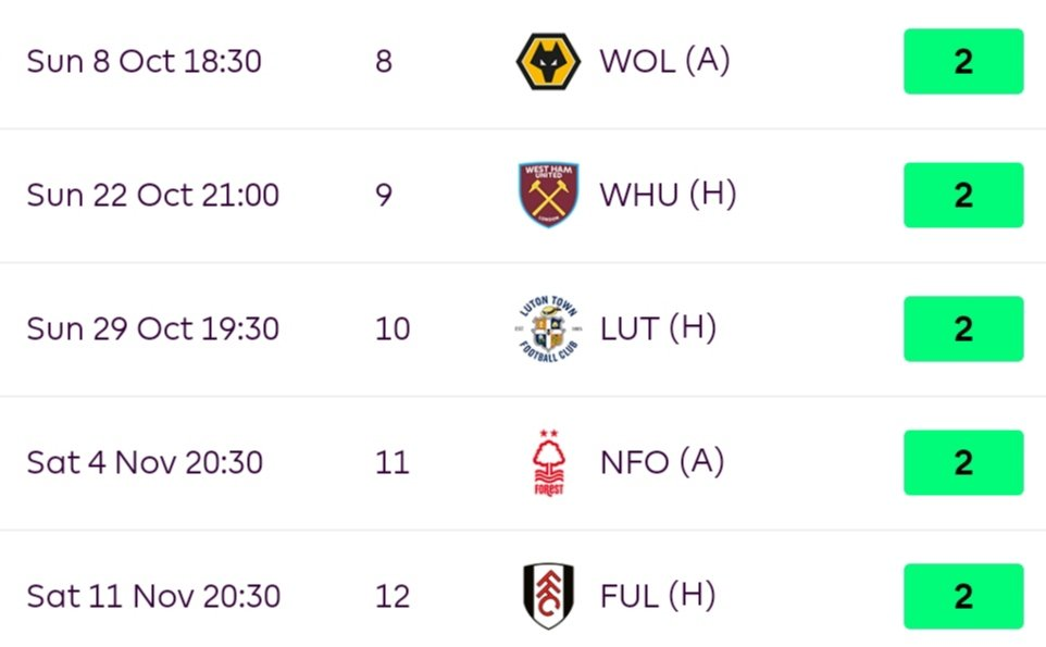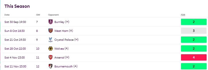Diaby has been impressive this season with 2 goals and 2 assists and keeps playing out of position in a striker partnership with Watkins. Diaby should be on every manager’s watchlist as the much-discussed GW9/10 fixture swing is coming, and Aston Villa’s fixtures are about to turn extremely favorable. Over the next six GWs, Diaby has the easiest schedule for attackers, which just raises his upside.