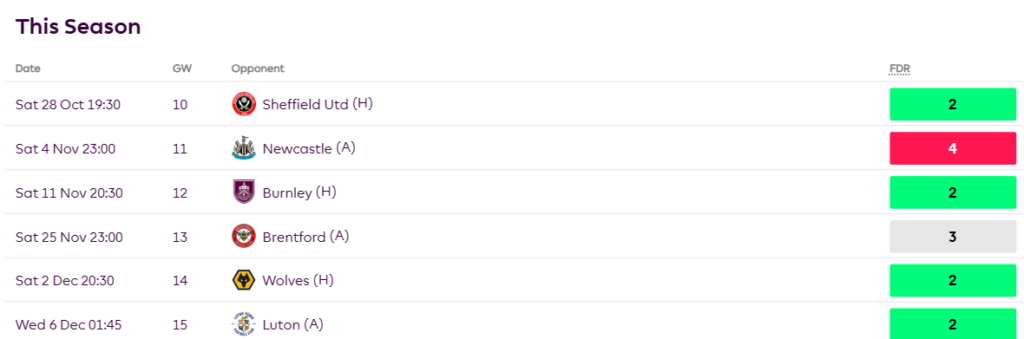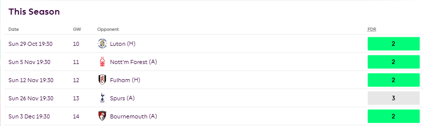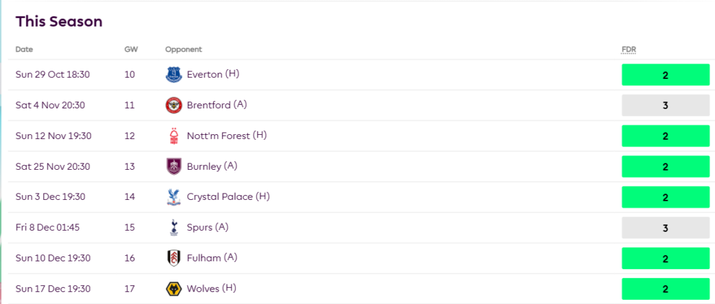 All these numbers despite playing teams like City, Chelsea, Liverpool, Newcastle and Villa during this run. When the fixtures turn from GW10 as seen below, more points should be coming his way.