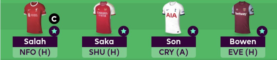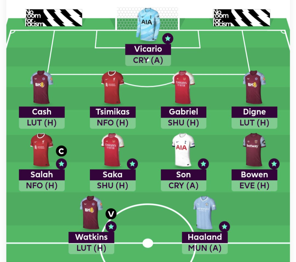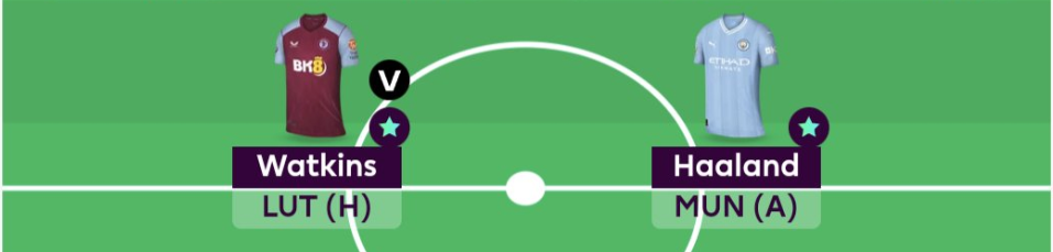 Haaland has not matched the Haaland standards of last season- Yet has 9 goals from 9 games this season. He does not take the captaincy due to the tougher fixture and other players like Salah/Saka/Watkins having much better fixtures. He is still a good option and should be tick along continuously- evident with a brace in the midweek UCL win over Young Boys.