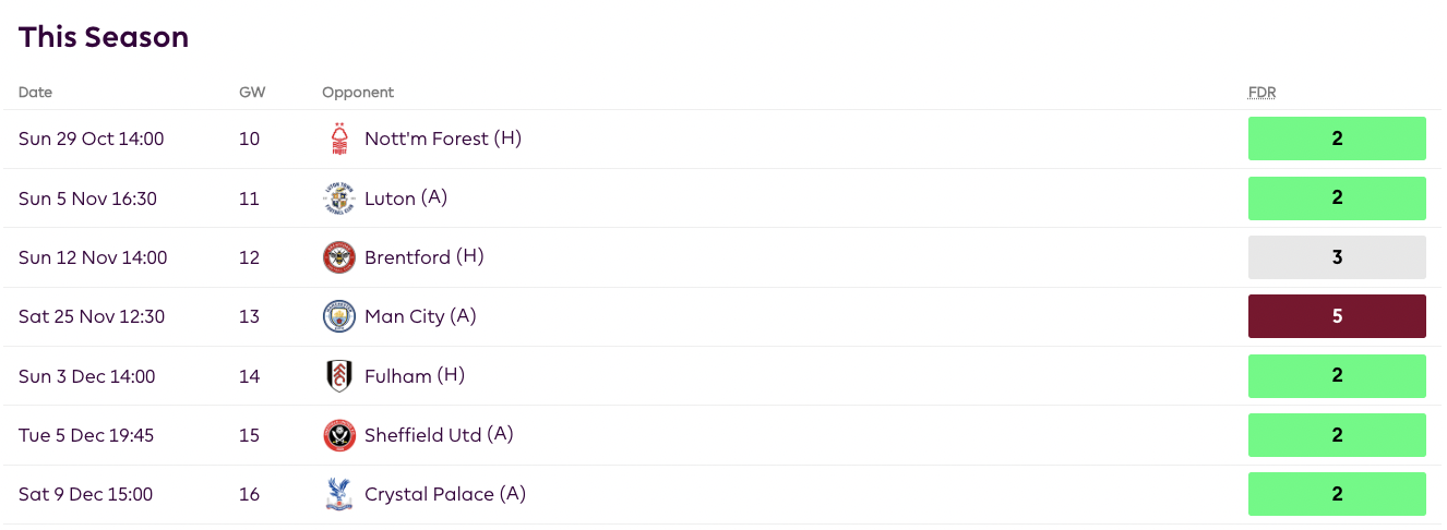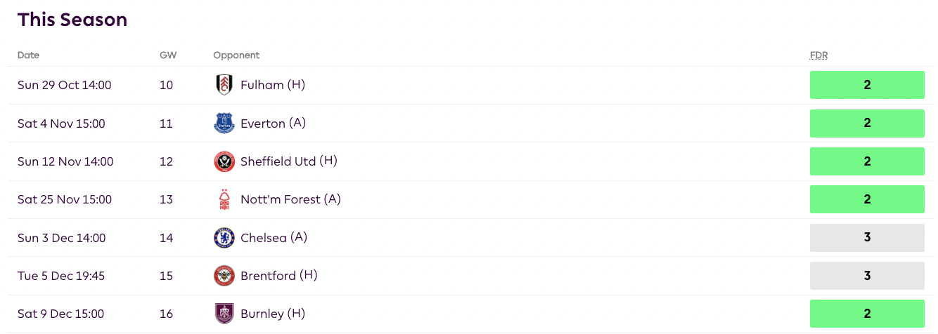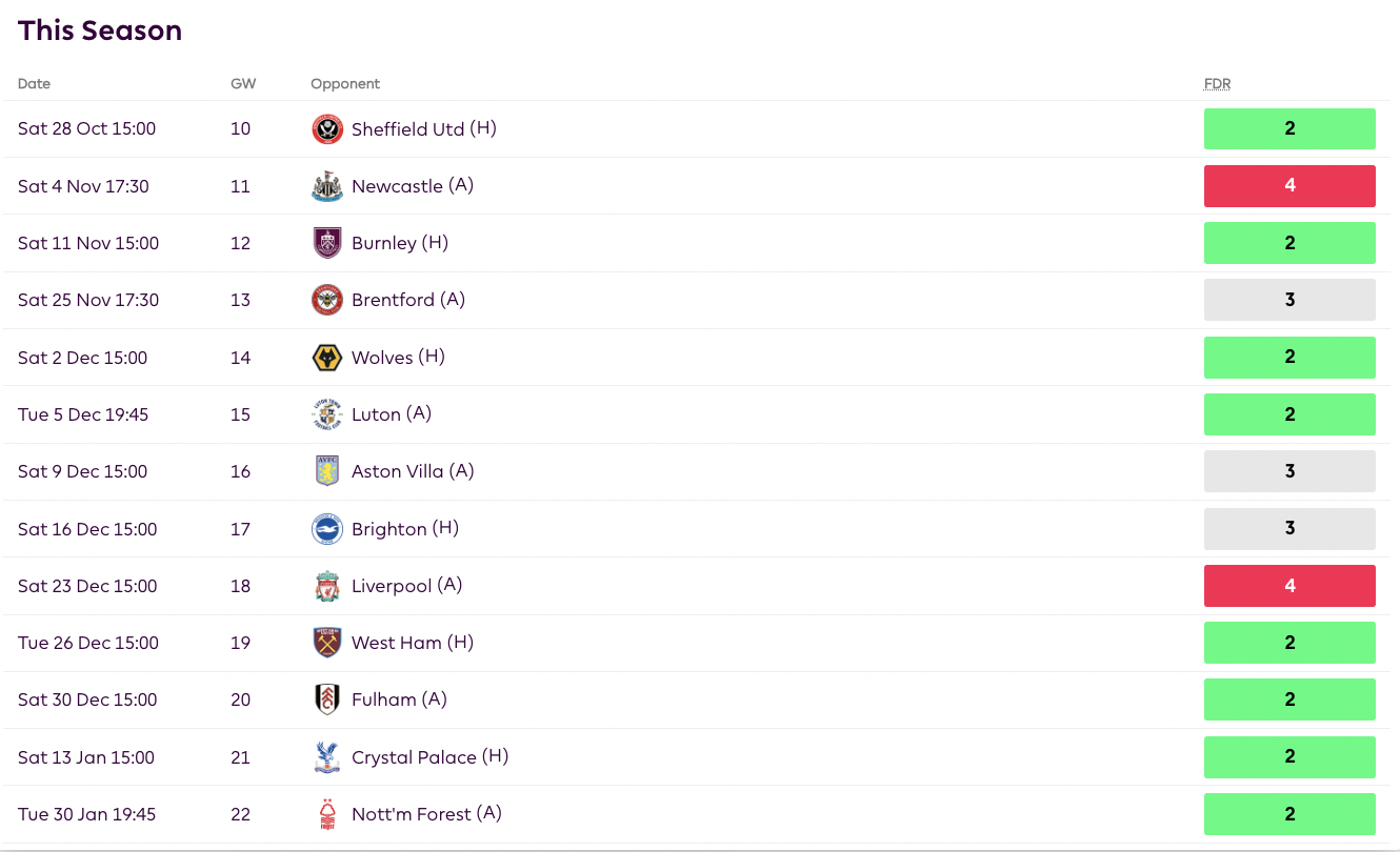 When the news came out that Robertson was going to require shoulder surgery and be sidelined for the rest of 2023, many managers shifted their attention to his obvious replacement in Tsimikas. Tsimikas rewarded his managers with a nice clean sheet after being subbed off early. The early sub is not something I would worry about, as Klopp went for an attacking sub to keep pressuring ten-man Everton. Tsimikas is a great asset and one that is firmly on my watchlist, as his fixtures are great, and he provides a decent attacking threat. Over the next six GWs, Liverpool has the 6th easiest defensive schedule, giving Tsimikas higher chances of clean sheets.