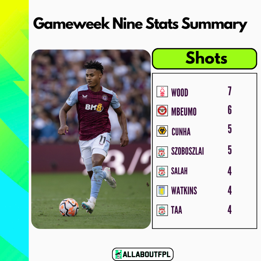 - Top players for Shots overall from GW1 – GW9: Haaland(34), Rashford(33), Salah(30), Watkins(29)