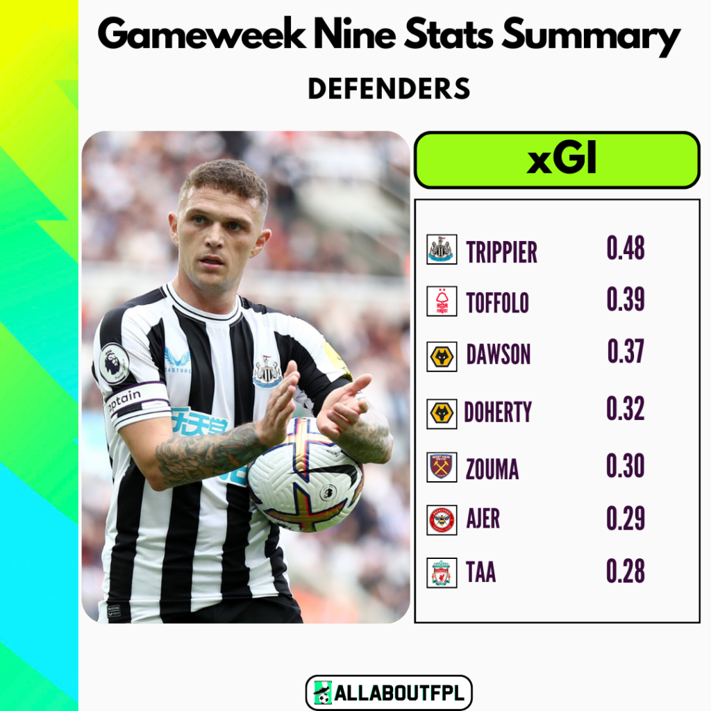 - Other notable DEFs for xGI in GW9: Guehi(0.27), Mitchell(0.26), Romero(0.26), Tsimikas(0.18)