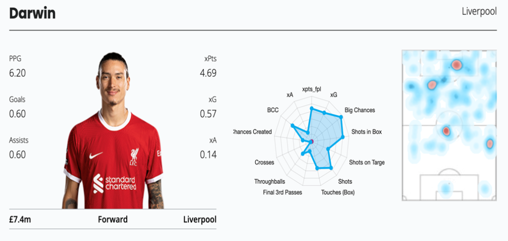 Ahh, old reliable Darwin is back on the watchlist as Liverpool’s fixtures are turning favorable, and including a second Liverpool attacker alongside Salah is a great high-upside idea. Liverpool has the easiest schedule for attackers over the next six GWs, giving their players a massive ceiling in the upcoming GWs. When Nunez plays, he is one of the best Liverpool attackers, with a massive 0.94 xGI per 90 minutes, showing just how high his ceiling can be. There is a worry Darwin might be rested for GW9 due to his return from South America from the International Break, so managers looking to bring Darwin in need monitor whether Darwin will start. We know how much of a troll Darwin can be, but with those fixtures and underlying stats, managers willing to put up with his missed Big Chances should add Darwin to their watchlist.