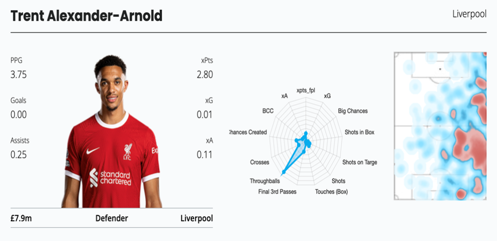 Liverpool have managed only one clean sheet from 8 games this season. But it is to be noted that they have played Brighton, Tottenham, Villa, Newcastle and Chelsea during this period. In the upcoming seven games, they play Everton, Forest, Luton, Fulham, Sheffield where there are more clean sheet chances and also attacking returns from Trent!
