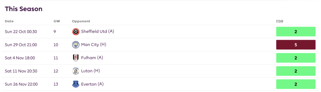 The fixtures going forward look pretty enticing from an FPL point of view. 7 out of the next 10 games have an FDR rating of 2. Meanwhile, their FPL GW9 opponents Brentford have won only 1 game this season and are yet to win at home.
