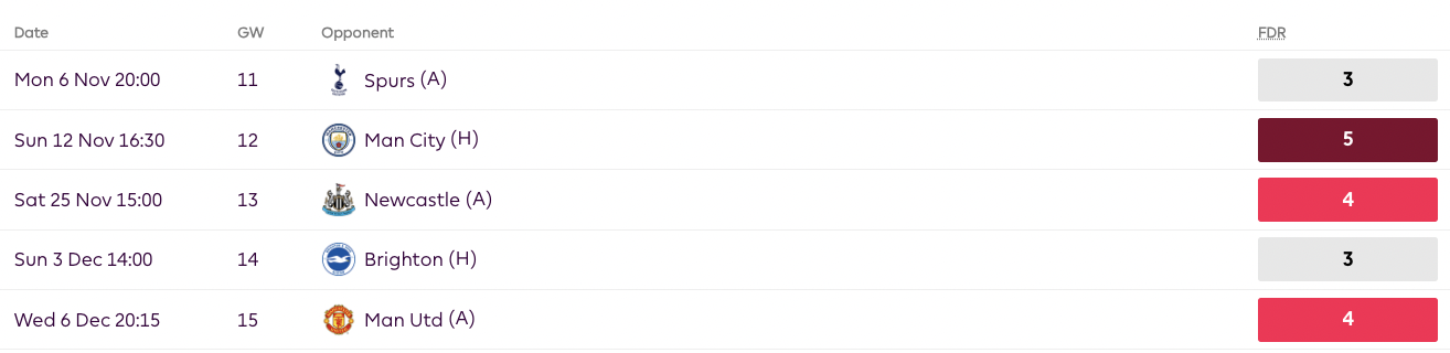 Crystal Palace rank top in terms of FDR in the short to medium term (GW 11-13 as well as GW 11-15)
