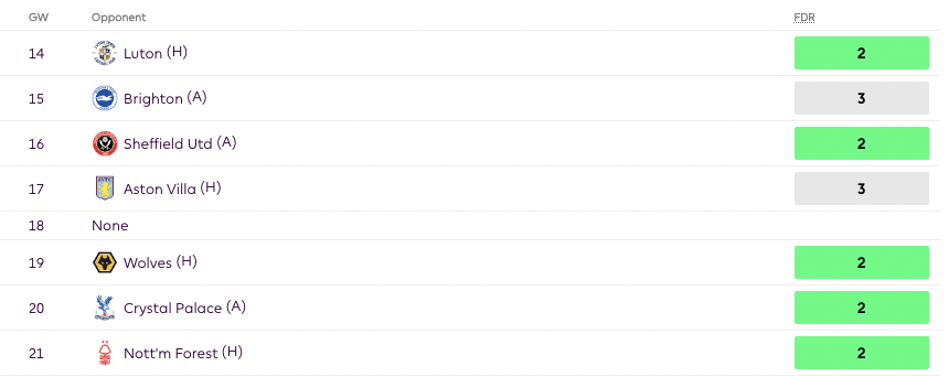 Lastly and most importantly, Newcastle are ranked 1st for FDR between GW 14-19