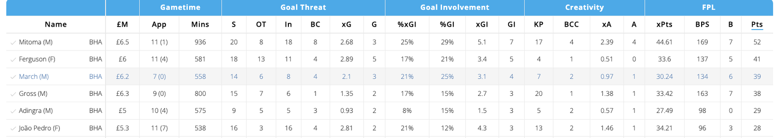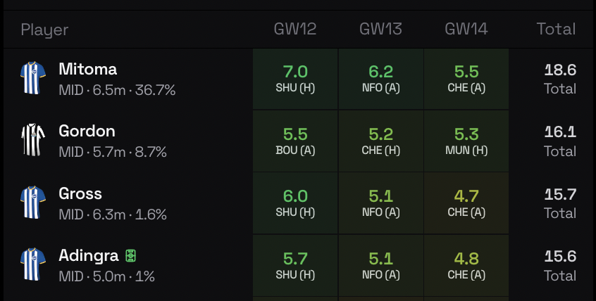 If you canโt afford players like Gordon and Hwang, you can look at enablers like Cole Palmer or Simon Adingra. Chelseaโs Palmer has done exceptionally well and is currently ranked 8th for xGI among all MIDs. Yes, most of his goal threat comes from penalties, but the same canโt be ignored. Chelseaโs fixtures till GW15 look slightly tricky, and you can go for Adingra if Palmer doesnโt convince you. He has started Brightonโs last 4 games and has better fixtures than the Chelsea midfielder. If you plan to play with 5 midfielders consistently, Adingra can be a great pick.