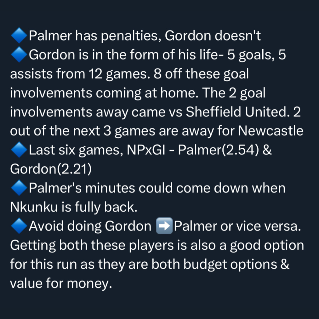 You can even go cheaper with Anthony Gordon from Newcastle or even Cole Palmer from Chelsea. Gordon already has 10 attacking returns for the season. On the other hand, Palmer has only blanked twice in the last 7 games. Both are at slightly different price points, Palmer being much cheaper. You can save money with one of these picks while having the flexibility to make upgrades elsewhere on the pitch.