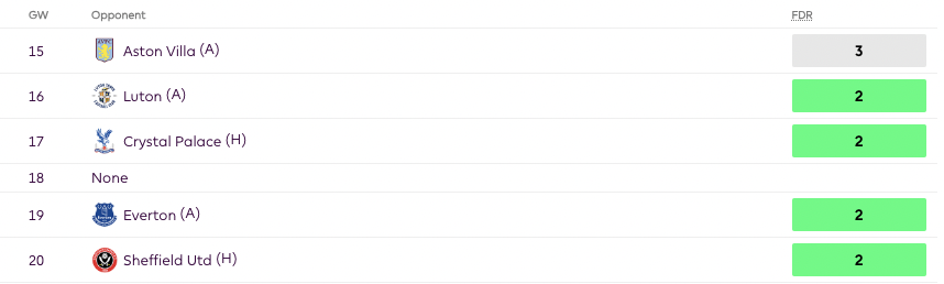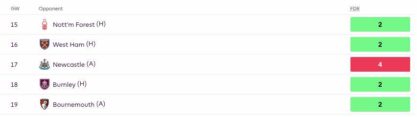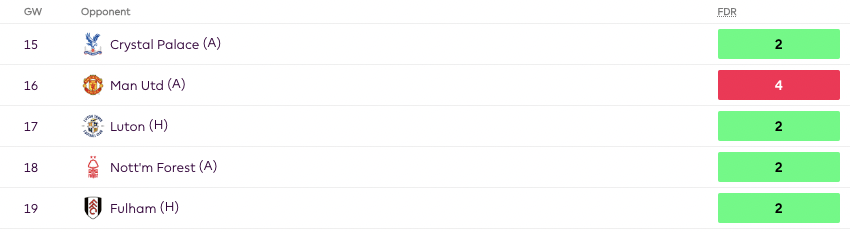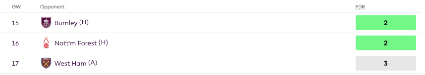 Beyond GW15 as well, Foden has favorable fixtures apart from the blank in GW18. Foden could be a good option during the festive period if you can plan to manage the blank in GW18 effectively!