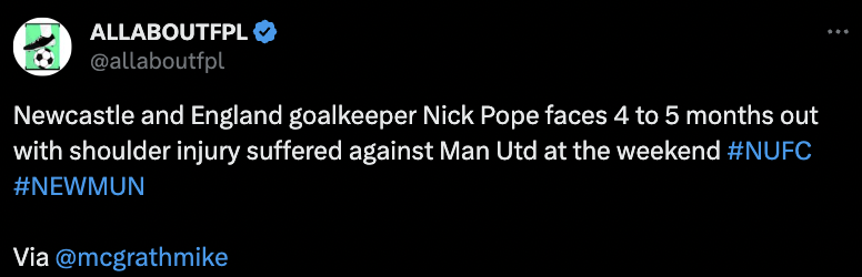 Nick Pope was taken off during the win vs Manchester United due to a dislocated shoulder. It looks like the injury is serious and Pope could be out for at least some weeks.