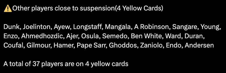 Close to suspension(4 Yellow Cards)