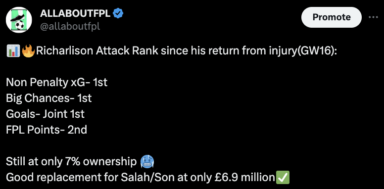 - Brenan Johnson(ยฃ5.8m): If you’re not keen on Richarlison then Johnson at ยฃ5.8m could be a good alternate to consider from the Spurs attack