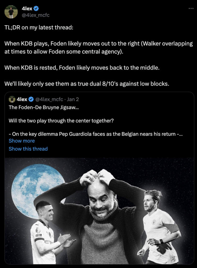 The citizens are on a roll, after breezing past Sheffield United, Pep’s men are weeks away from a fully fit squad with the ever closer return of both KDB and Haaland. Pep suggested in a recent press conference that De Bruyne, Doku and Haaland may all to be back for GW22, which unfortunately may limit Foden’s minutes in his preferred N.10 role, but could make KDB a superb ‘differential’.