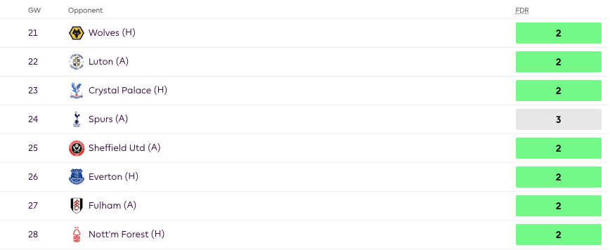 Moreover, after Palace in GW21, they face a revitalized Forest Away in GW22, Liverpool in GW23 and then West Ham in GW24, so I’m not sure the double-up is worth it for the price, especially considering The Gunners’ recent form.