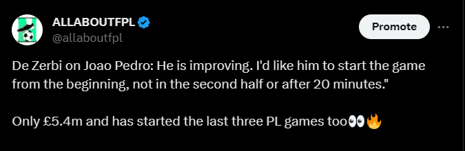 I know, I know, he has trolled managers twice this season with the benchings early in the season. However, with all of the injuries that Brighton has and his current form, I do think he is one of the forwards to keep on our watchlist. Joao Pedro has the easiest schedule for attackers over the next 8 GWs, which raises his already high ceiling.