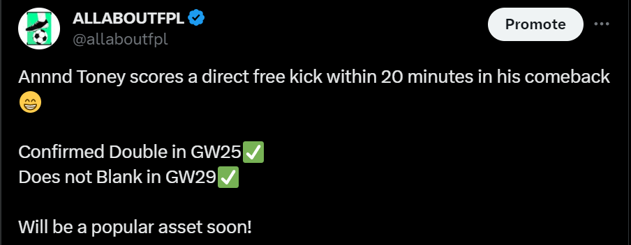 - Toney is back into the mix with a goal in his return game. As it stands, Brentford are the only team confirmed to Double in GW25 and also not blank in GW29.