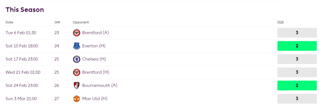 Suppose Trent does have that DGW25, then TAA’s defensive schedule would rank as the 2nd easiest over the next 6 GWs. Trent has also massively improved his underlying stats with a 0.37 xGI per 90 minutes, which was not the same earlier in the season. If we get the news that Liverpool does double in GW25, then he will be the best defender to own in the upcoming GWs and should be on all of our watchlists.