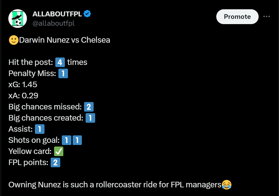 Darwin Nunez owners can consider themselves unlucky after this performance vs Chelsea. He did hit the post 4 times and missed a penalty as it could have been a massive Double digit haul. Darwin’s 11 Shots vs Chelsea is the Highest for any player in a single game in Premier League this season. He did end up with only 2 points but it looks like better days are coming soon for Darwin!