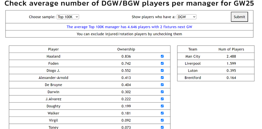 The average top 100k manager has 4.65 players with double GW25 fixtures, before transfers made after the deadline. 2.5 from City, 1.6 from Liverpool, 0.4 from Luton, and 0.16 from Brentford. Data from @LiveFPLnet