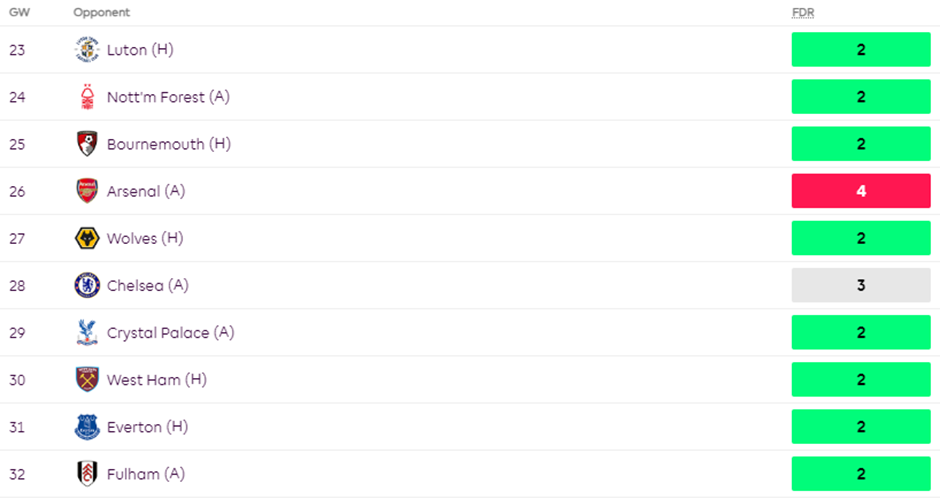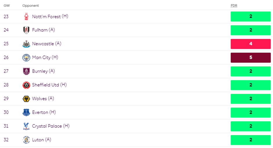 His short-term fixtures also don’t seem appealing as WHU faces Man Utd and Arsenal in GW23 and GW24.