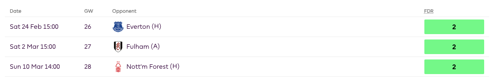 Even beyond GW26, Estupiñán’s medium-term fixtures look very good.