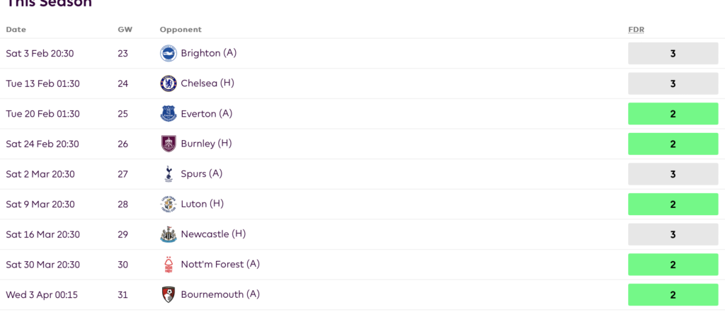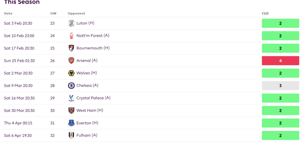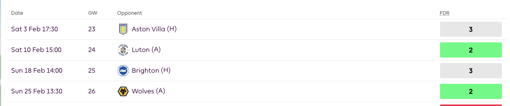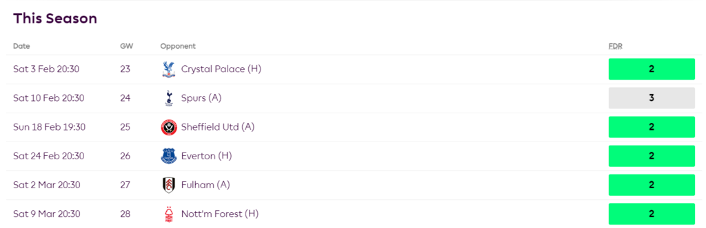 Roy Hodgson’s men have a great run of games coming up. Each of their next nine fixtures have an FDR rating of either 2 or 3. Five of Palace’s six wins this season have come against such opponents. Brighton are fresh off from a 4-0 drubbing at the hands of Luton town. Who is to say that Olise and Co can’t pile more misery on their arch-rivals?