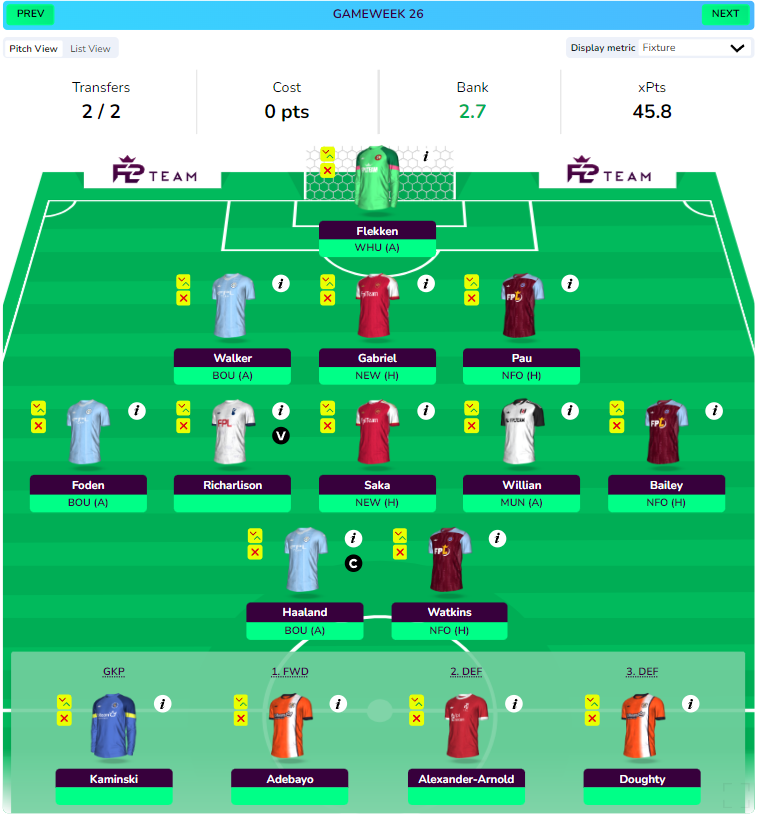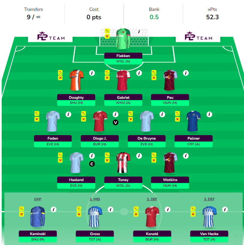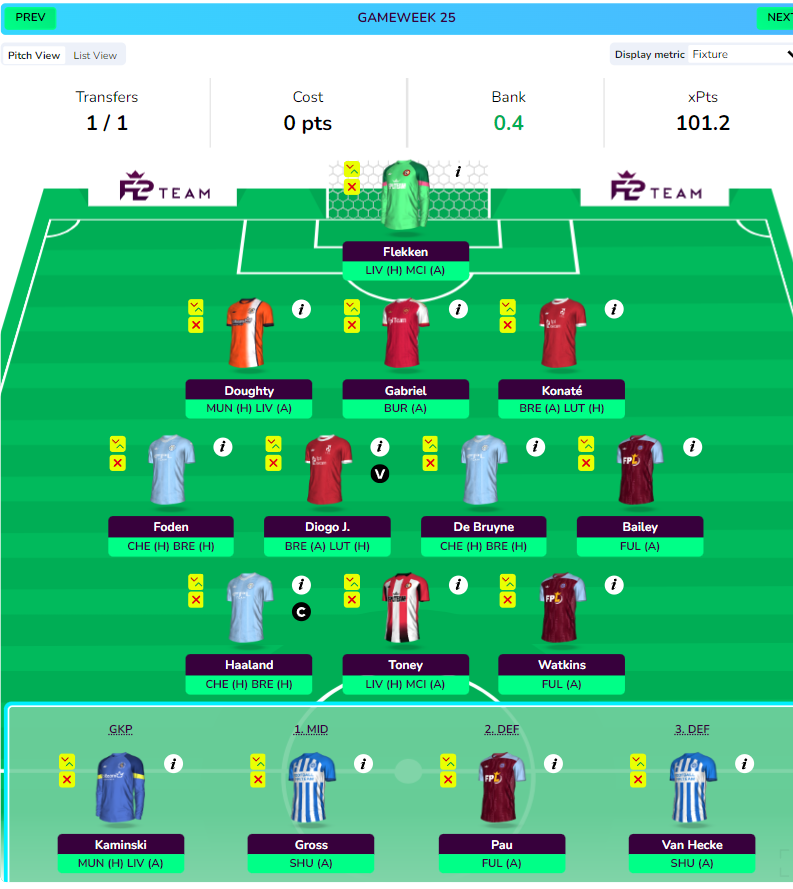 - One with Watkins, Toney, and Haaland front 3. Plan to get Solanke in GW28 for Toney.