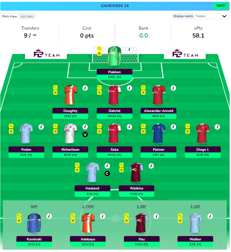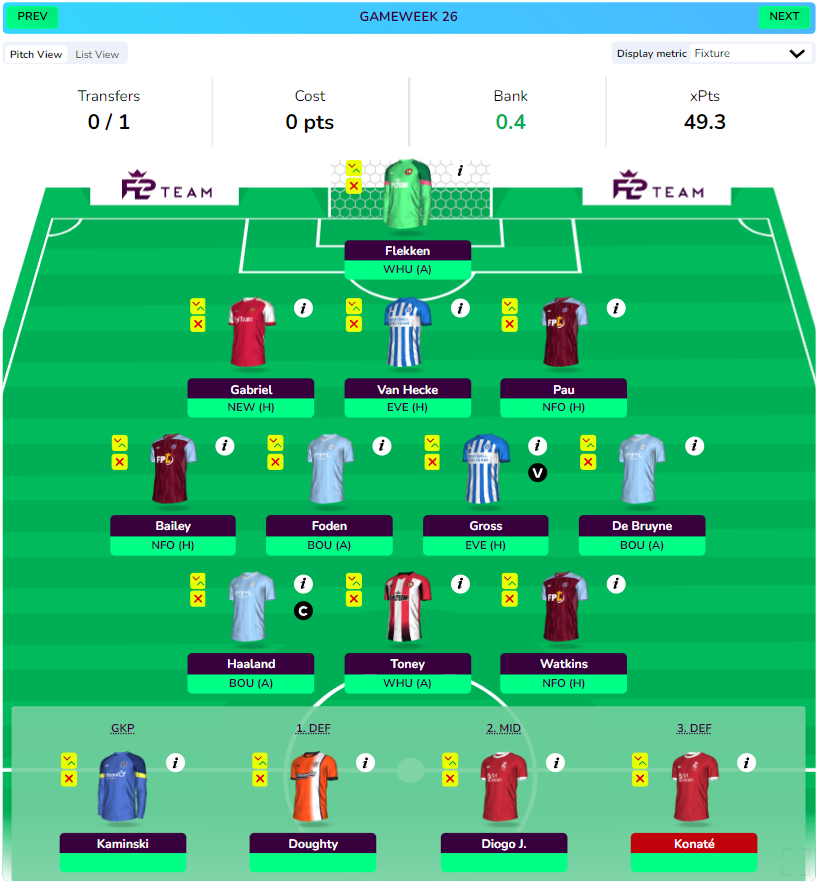 - More attacking draft with a City attack triple-up of KDB, Foden, and Haaland to chase upside. The sacrifice comes in the form of TAA who is downgraded to Konate who should be back for DGW25 after suspension. No Saka is another gamble taken in this draft.