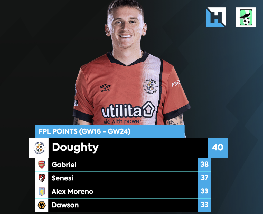 If you are planning to triple up on City attackers then Luton’s defenders could offer great value. There has been a lot of noise in the community around Mengi who is, at the time of writing, less than ยฃ4 million, and a consistent starter for the hatters, but with 5 assists and 1 goal so far this season and only ยฃ0.7 million more expensive, I think Doughty is the best option. It’s difficult to be optimistic about Luton’s clean sheet chances against Manchester United and Liverpool, and Doughty offers much more attacking threat than Mengi.