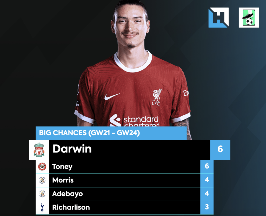 A cheaper alternative to those three is Luton’s Adebayo(ยฃ4.9m), who has scored in 3 of his last 5 games and is averaging 0.70G/90, more than both Toney and Nunez. If you’re strapped for cash then Adebayo is the one to go for, especially considering Luton also double in GW28.