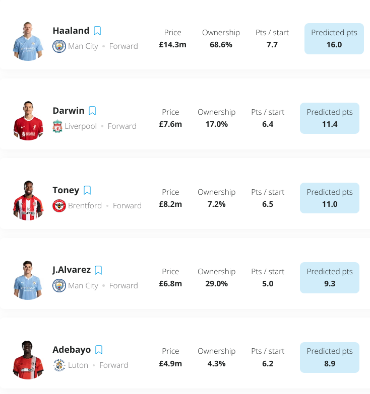 Using Fantasy Football Hub’s predicted points tool we can see how each of the forwards discussed in this section is likely to fare in FPL DG25!