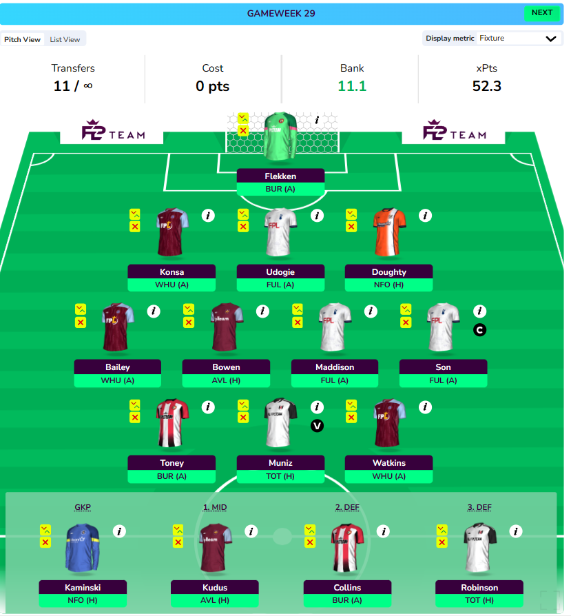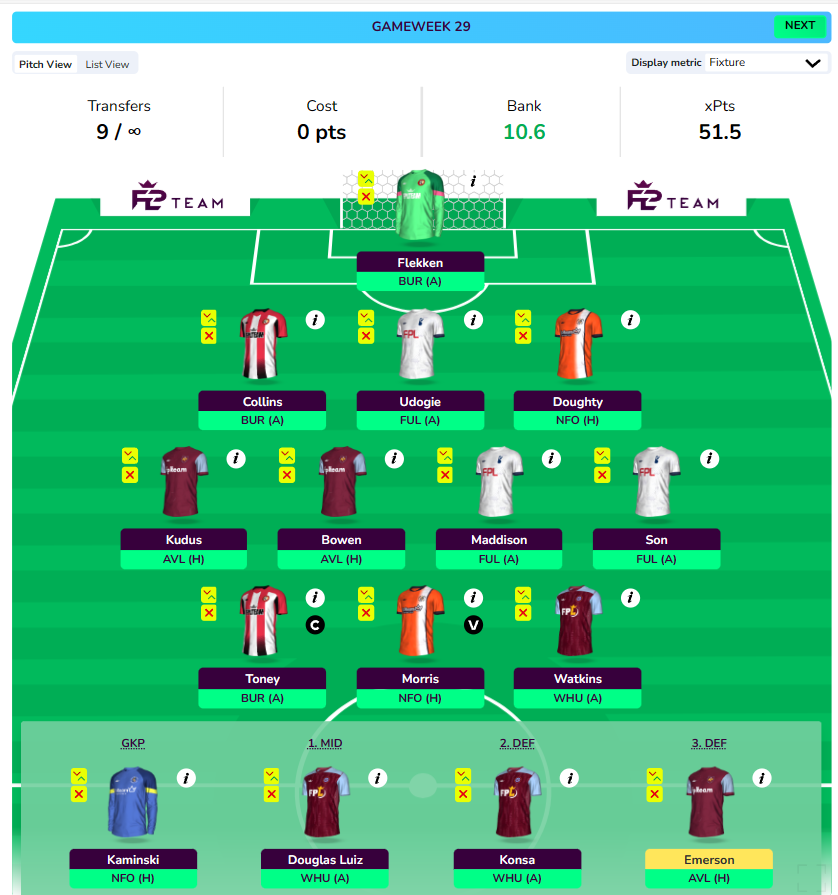 Note: Both Aston Villa(vs Ajax) and West Ham(vs Freiburg) have important European games on Thursday night. This might cause some rotation in GW29 and it is best to go for absolutely nailed assets.