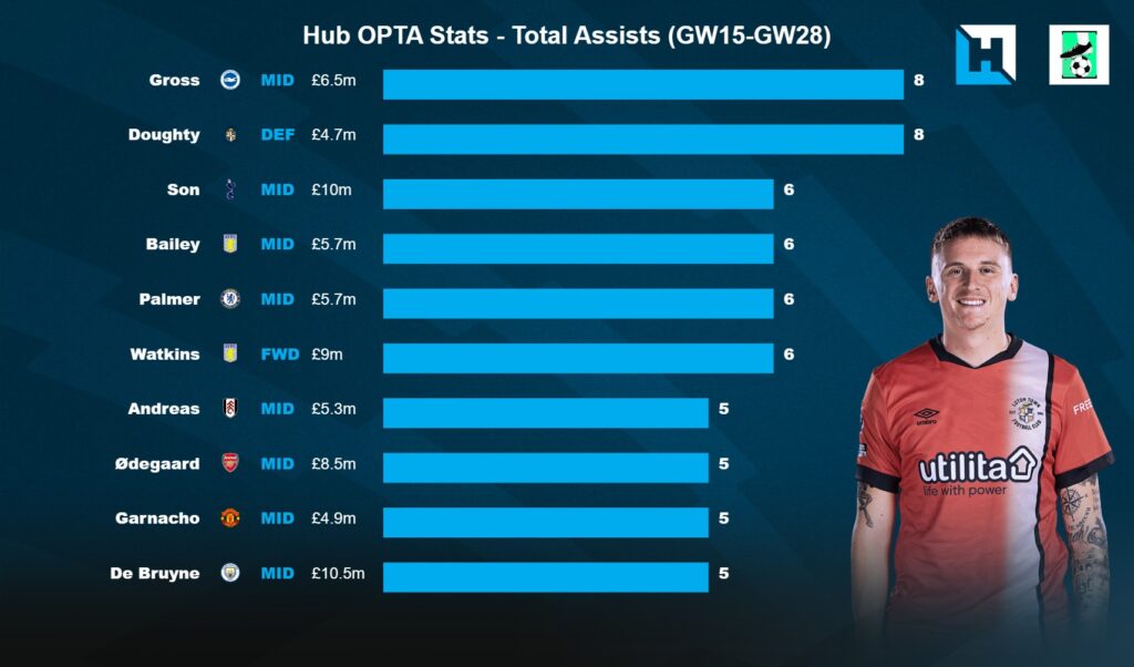 Doughty takes all the set pieces and corners for Luton. He is Top for xA(3.08), 2nd Highest for Chances created(31), and Big Chances created(7) among Defenders since GW15. In fact, Doughty is joint Top for Assists(8) among all players in the league since GW15.