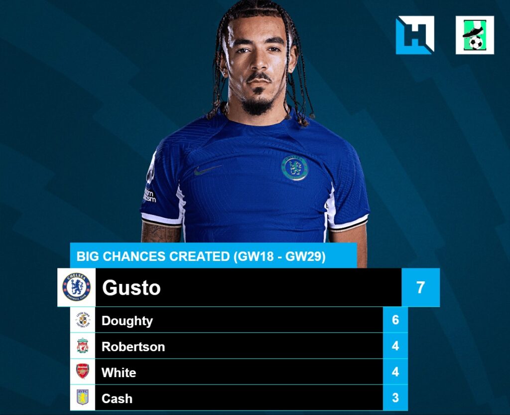 Key Stat: Since his return from injury in GW18, Gusto is Top for Big Chances created(7), 2nd best for xA(2.06) and Joint 2nd for Assists(3) among Defenders.