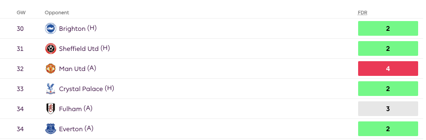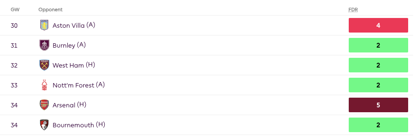 Malo Gusto is certainly on the radar of FPL managers with a fixture vs Burnley(H) in GW30. To add to this Gusto is likely to have a Double Gameweek in GW36- Aston Villa(A), Spurs(H) and GW37- West Ham(H), Brighton(A). Even before these 2 DGWs, the fixtures look really good with games vs Burnley, Sheffield United and Everton. These are kind of matches where there is clean sheet potential and attack potential as well. Even though Chelsea have kept only two clean sheets since GW18, Chelsea’s underlying numbers are decent as Chelsea have conceded 2nd least Big Chances and have the 5th best xGC during this time.