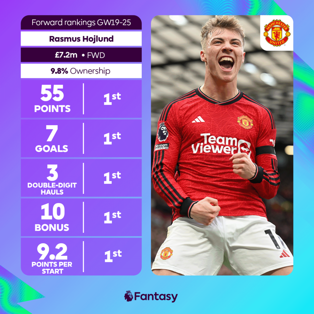 Before his injury, Hojlund scored 7 goals and two assists in six PL games and was the 2nd highest-scoring player(48 pts) during the period(GW20-25) with only Saka outscoring him.