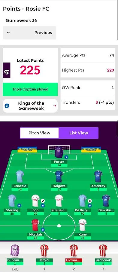 Rosie Barry of Australia got this banger of a score, getting 225 points. She took a 4-point hit that week and brought in KDB, Nketiah, and Holgate. These three players alone rewarded her with a mammoth 118 points.