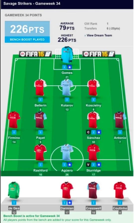 If you are looking for Bench Boost inspiration in a Double Gameweek with multiple hits, you are at the right place. A team called Savage Strikers took a 20-point hit in GW34 of the 2015/16 season to fetch 226(-20)= 202 points.