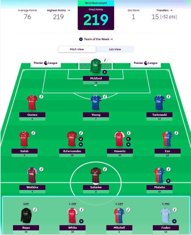 Branthwaite and Pickford kept 2/2 clean sheets in the DGW including a famous win over Liverpool. Branthwaite also got a goal. Odegaard got one goal, 2 assists to hit the 20 point mark. Bruno Fernandes only had a single Gameweek but got 2 goals and an assist vs Sheffield United. Eze got a goal and an assist to fetch 14 points in wins over West Ham and Newcastle at home.