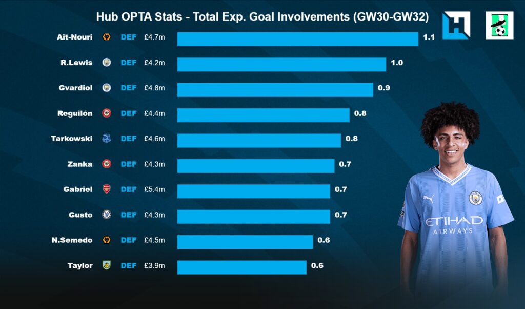 Rico Lewis got a goal in the 2-4 win vs Crystal Palace in GW32. With the defensive injuries at Manchester City, Lewis has started the last 3 league matches. During this time, Lewis had 3 Shots inside the box, 5 chances created, 2 Big Chances created and 1.0 xGI. Only Ait Nouri(1.1) has a better xGI among Defenders during this time.