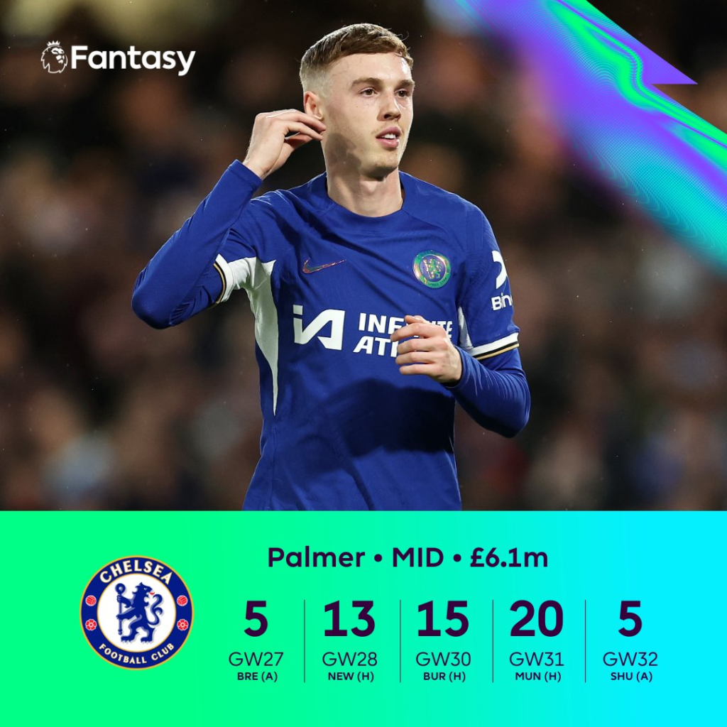 Cole Palmer has become a no-brainer pick these days considering the form he is in. He is still fresh from his incredible hattrick vs Man United in GW31 and has not blanked in the last 5 matches. Palmer has 26 goal involvements(16 goals, 10 assists) from 23 matches since he became a starter for Chelsea in GW7.