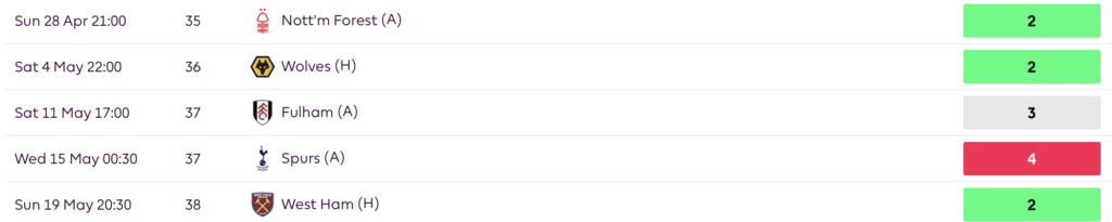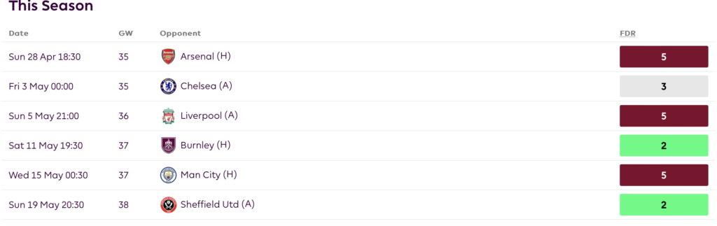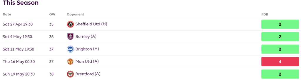 Eddie Howe’s men have a phenomenal run of games from now up and till the end of the season. Four of their remaining five matches have an FDR rating of 2. Their next two fixtures are against the lowest scorers (Sheffield United- 33) and the third lowest scorers (Burnley- 37) in the league.