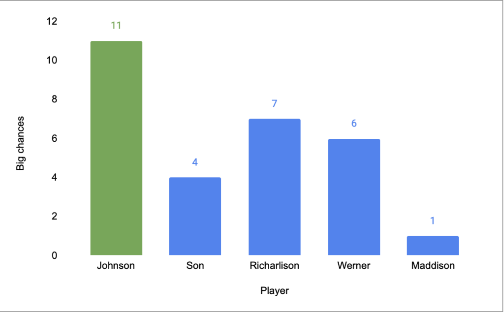 Although Johnson hasn’t got himself on the scoresheet as often as the other big hitters in the league, he clearly is the biggest goal threat from Spurs with 11 big chances to his name since GW18. The next best is Richarlison with 7, and Son has had only 4.