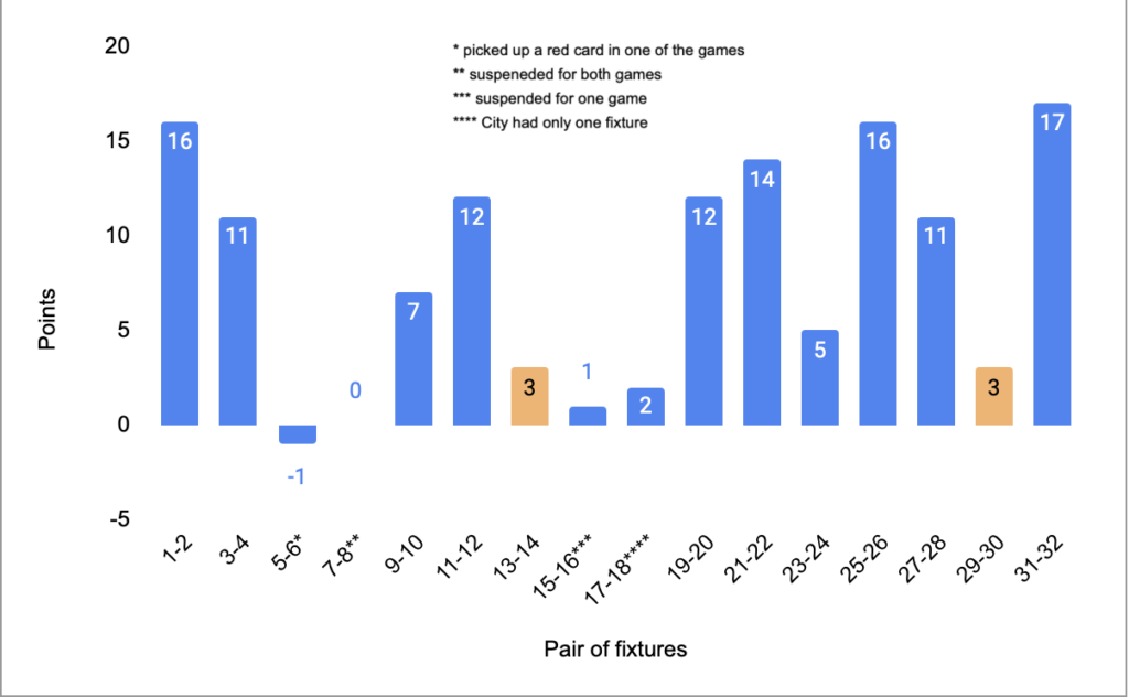 If we take a look at Rodri’s performances this season in FPL as a pair of fixtures, The Spaniard has had 8 double digit hauls out of the 16 pairs. That is a 50% hit ratio. In four of the remaining eight pairs, Rodri missed games due to suspension/ picked up a red card or City had only one fixture. Effectively, he has blanked only twice in any pair of fixtures that he has fully played in ( GW13-14 and 29-30).