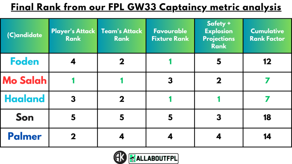 Conclusion – Final Rank from our FPL Gameweek 33 Captaincy metrics