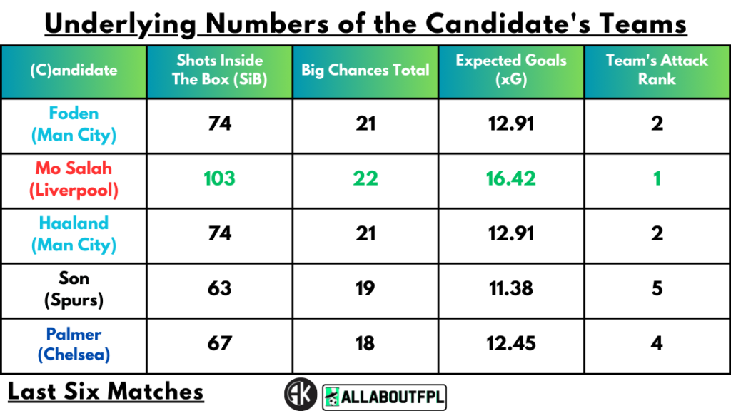 Palmer is 2nd ahead of Haaland registering an xG of 4.02 in the last six games along with 4 big chances, and 16 goal attempts in the box. He has also created 20 chances which is the highest amongst the five players