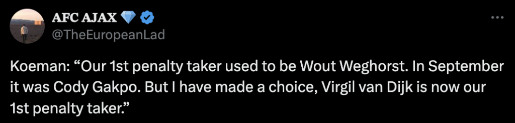 Koeman: “Our 1st penalty taker used to be Wout Weghorst. In September it was Cody Gakpo. But I have made a choice, Virgil van Dijk is now our 1st penalty taker.”