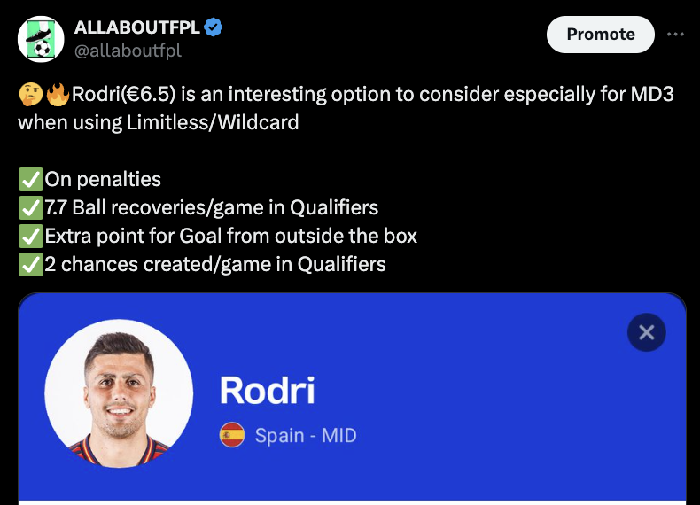 Rodri €6.5m is also another option in this price bracket which is on pens and also capable of ball recoveries, though the first two games against Croatia and Italy are taught ones.